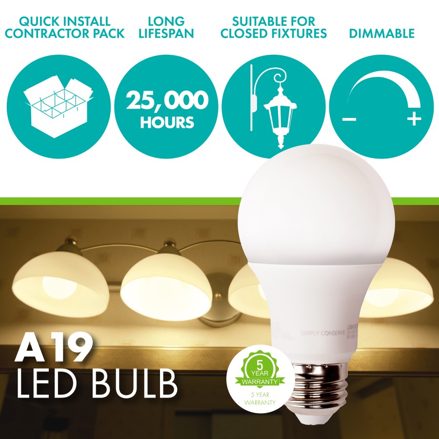 Simply Conserve 9W (60W EQ) A19 LED Light Bulb, 2700K, Maintenance Pack of 60